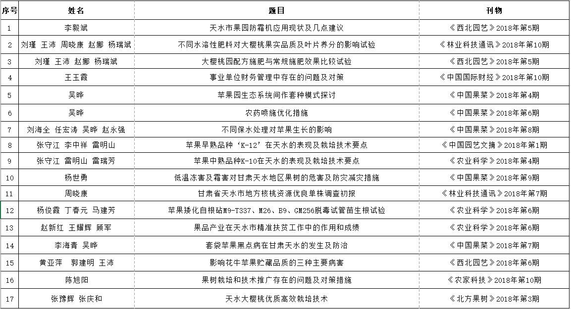 天水市果树研究所2018年技术人员发表论文一览表