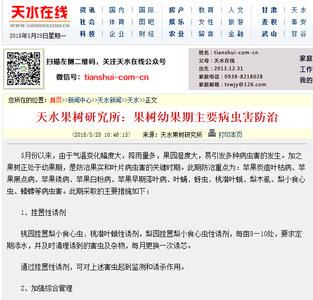 天水市果树研究所第4期病虫情预报在"天水在线"发布